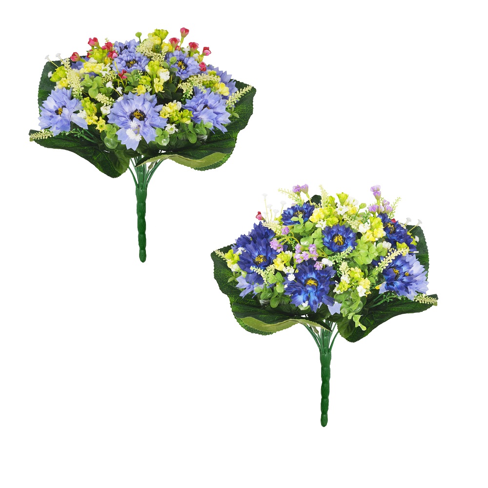 Country look bouquet of popular blue cornflowers, filler flowers and large foliage leaves