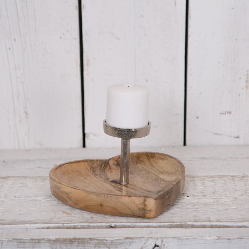 Stunning aluminium tealight holder raised on a heart-shaped wooden base.