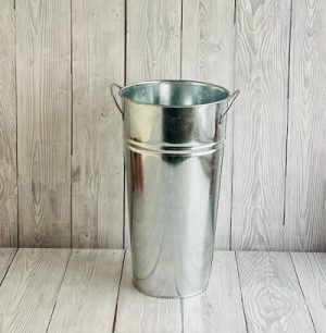 Galvanised Flower Vase with ear handles Stackable for easy storage Please use with a plastic liner as galvanised vases are not guaranteed watertight