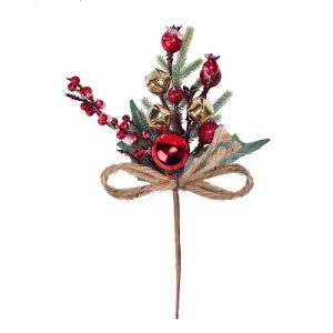 More unusual looking pick with bells, red berries, bauble, pine spray, frosted and finished with a natural twine bow