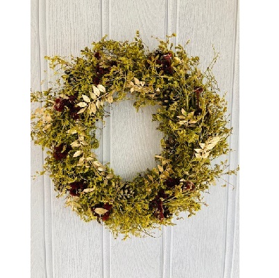 A Christmas Dried Flower Wreath with delicate soft grasses, pine cones and ruscus