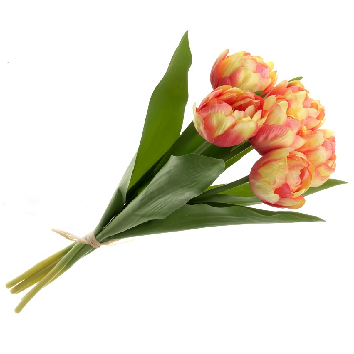 Realistic hand tied bunch of double peach tulips