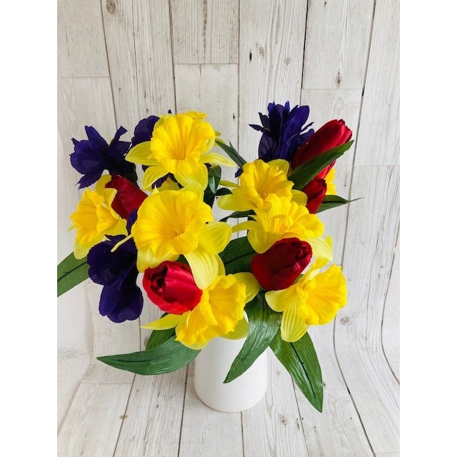 Cheerful Spring time mix of yellow Daffodils, purple Iris & red Tulips